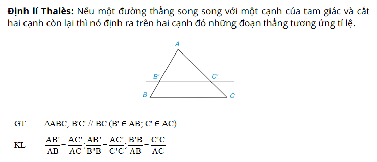 $-$ Định lí Thalès: Nếu một đường thẳng song song với một cạnh của tam giác và cắt hai cạnh còn lại thì nó định ra trên hai cạnh đó những đoạn thẳng tương ứng tỉ lệ