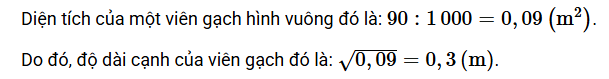 Do đó, độ dài cạnh của viên gạch đó là:$\sqrt{0,09}=0,3m$