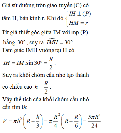 Để giải bài toán này, ta cần tính thể tích của khối chỏm cầu nhỏ tạo thành khi mặt phẳng (P) cắt khối cầu tâm I bán kính R.