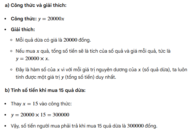 a) Để viết công thức biểu thị số tiền \( y \) (đồng) mà người mua phải trả khi mua \( x \) quả dừa xiêm xanh, ta có: