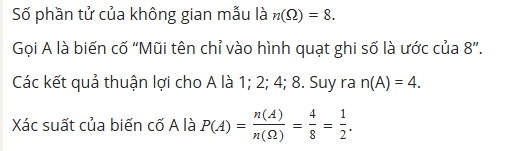 Vậy, xác suất để mũi tên chỉ vào hình quạt ghi số là ước của 8 là $\frac{1}{2}$.
