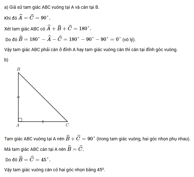 a) Tam giác vuông cân thì cân tại đỉnh góc vuông: