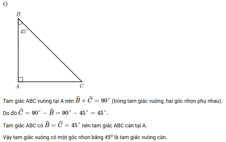 c) Tam giác vuông có một góc nhọn bằng 45 độ là tam giác vuông cân: