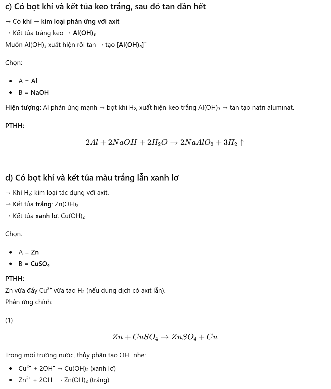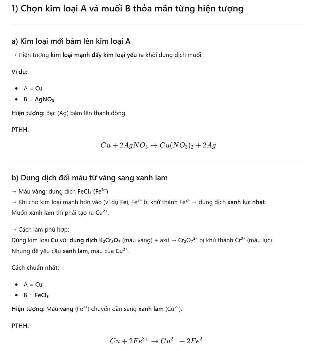 1) **Tìm một kim loại A, một muối B phù hợp với mỗi thí nghiệm:**