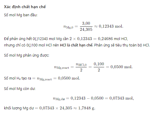 - Khối lượng của Mg là 3 g, mà khối lượng mol của Mg là 24 g/mol. Vậy số mol Mg là: