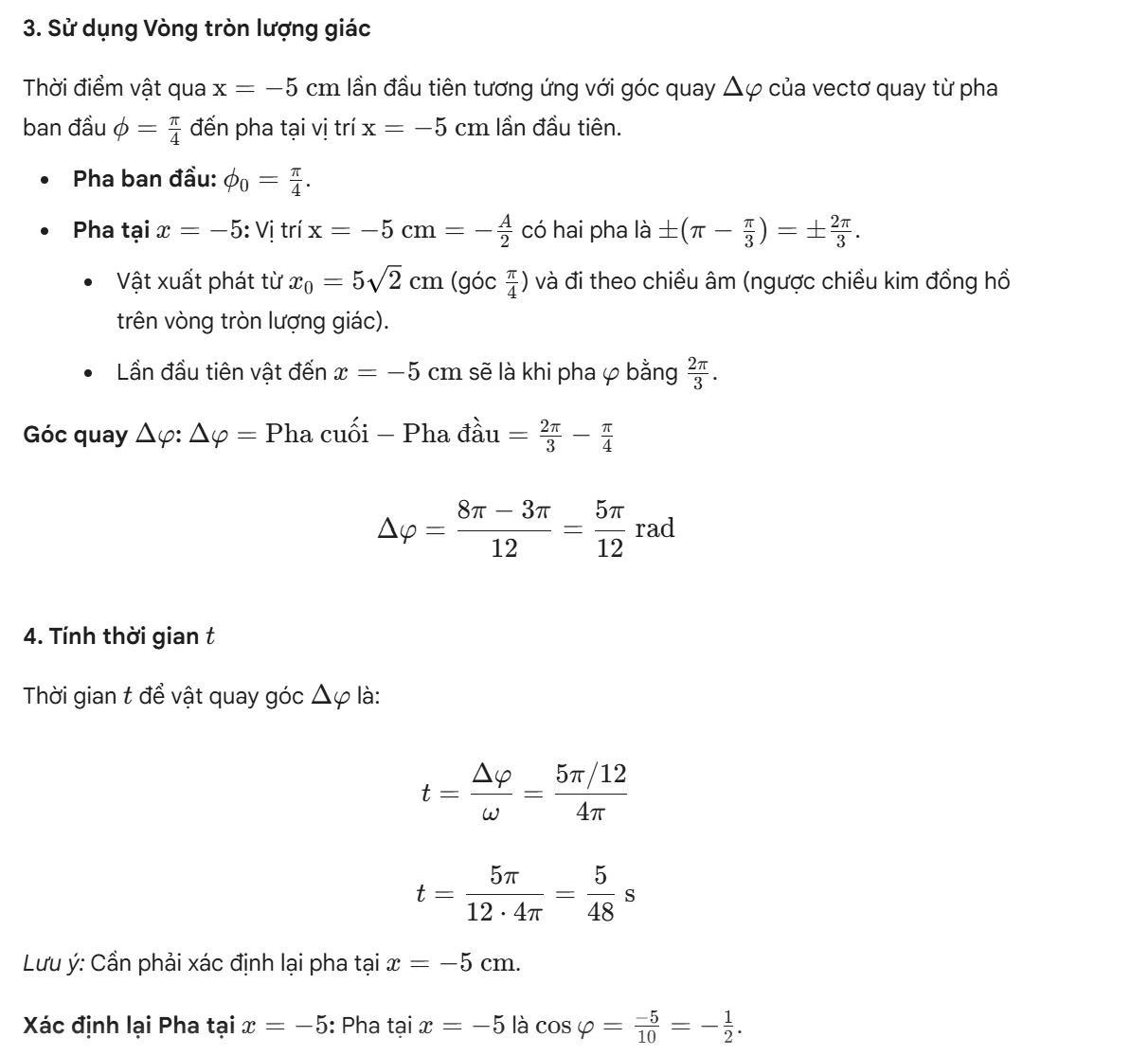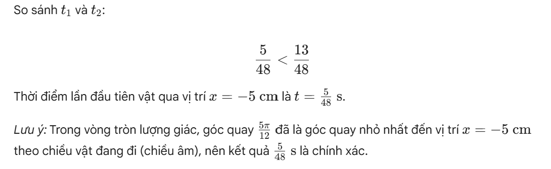 Ta cần tìm thời điểm \( t > 0 \) sao cho vật đi qua vị trí có li độ \( x = -5 \, cm \) lần đầu tiên kể từ lúc \( t=0 \).