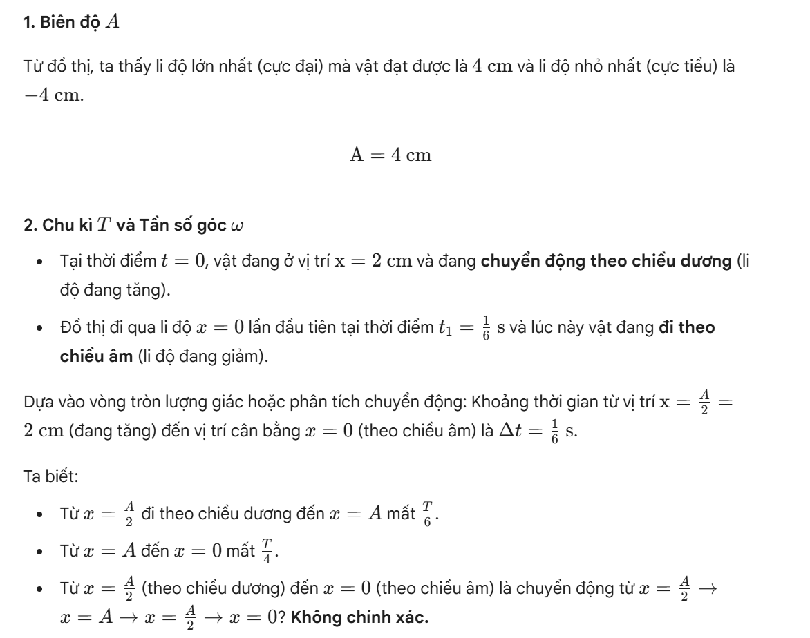 Từ đồ thị, khi \( t=0 \), vật có li độ \( x = 0 \) và đang chuyển động theo chiều dương (li độ tăng dần từ 0). Với dạng hàm cos, khi \( t=0 \), \( x = A \cos \varphi \).