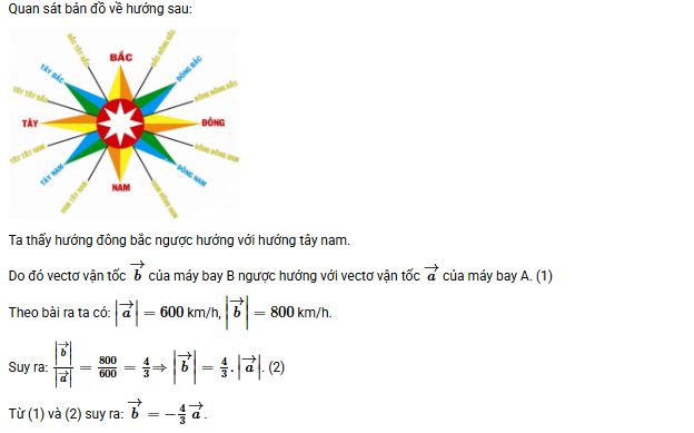 - Độ lớn của $\overrightarrow{a}$ là 600 km/h và $\overrightarrow{b}$ là 800 km/h.