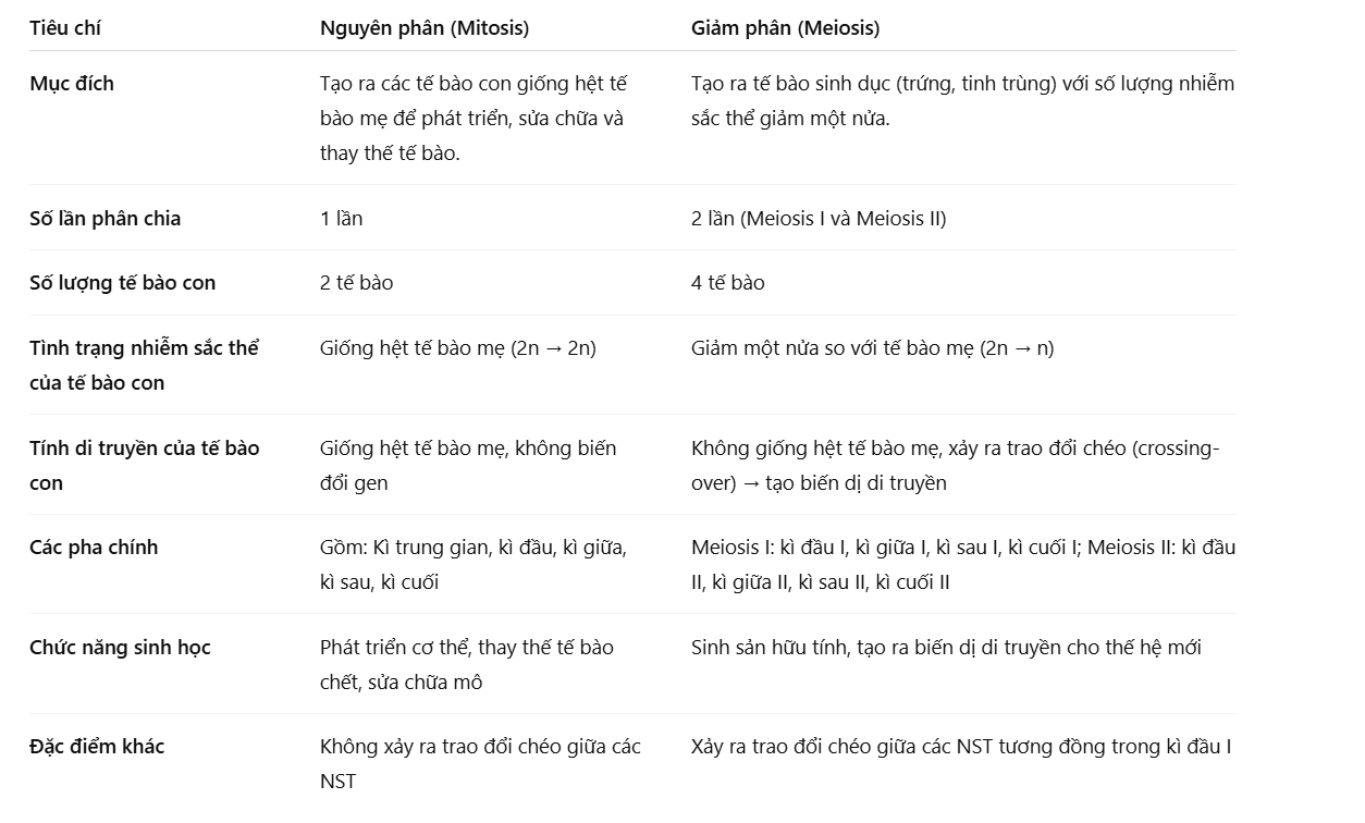 Tiêu chí Nguyên phân (Mitosis) Giảm phân (Meiosis) Số lần phân bào 1 lần 2 lần liên tiếp (giảm phân I và giảm phân II) Số tế bào con tạo ra 2 tế bào con 4 tế bào con Bộ nhiễm sắc thể của tế bào con Giống hệt tế bào mẹ (2n → 2n) Giảm đi một nửa (2n → n) Sự trao đổi chéo (hoán vị gen) Không xảy ra Xảy ra ở kỳ đầu I, tạo biến dị di truyền Sự phân ly NST tương đồng Không có cặp NST tương đồng, NST tách cromatit ở kỳ sau Giảm phân I: các cặp NST tương đồng phân ly. Giảm phân II: các cromatit tách nhau Tính di truyền của tế bào con Giống nhau và giống tế bào mẹ Khác nhau và khác tế bào mẹ Mục đích / Vai trò Tăng trưởng, thay thế, sửa chữa mô; sinh sản vô tính Tạo giao tử (ở động vật) hoặc bào tử (ở thực vật); duy trì số lượng NST đặc trưng Diễn biến kỳ giữa NST xếp thành một hàng trên mặt phẳng xích đạo Giảm phân I: các NST tương đồng xếp thành 2 hàng. Giảm phân II: xếp 1 hàng như nguyên phân Ở sinh vật đơn bội / đa bội Có thể xảy ra ở cả đơn bội và đa bội Chỉ xảy ra ở sinh vật lưỡng bội (2n) Ý nghĩa di truyền Duy trì ổn định bộ NST qua các thế hệ tế bào Tạo nguồn biến dị tổ hợp, là cơ sở tiến hóa và chọn giống