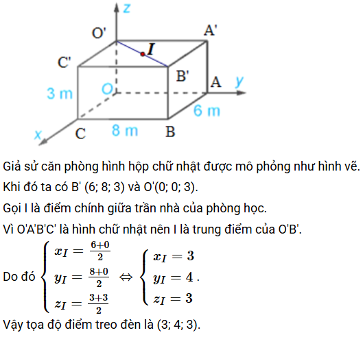 - Vì đèn ở chính giữa trần nhà, nên tọa độ của nó theo trục \( Ox \) là trung điểm của chiều dài, tức là \( \frac{8}{2} = 4 \) m.