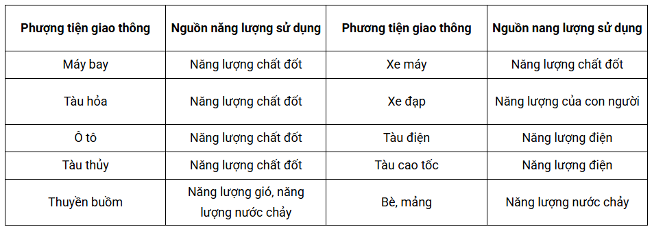 | Phương tiện giao thông | Nguồn năng lượng sử dụng | Phương tiện giao thông | Nguồn năng lượng sử dụng |