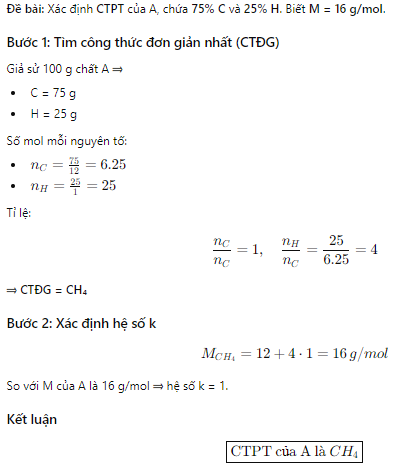 **Bước 4: Xác định CTPT của A chứa 76% C và 25% H. Biết KL ptử A = 16 cm³.**