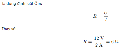 Điện trở của đoạn mạch là: $R = \frac{12 \text{ V}}{2 \text{ A}} = 6 \text{ } \Omega$