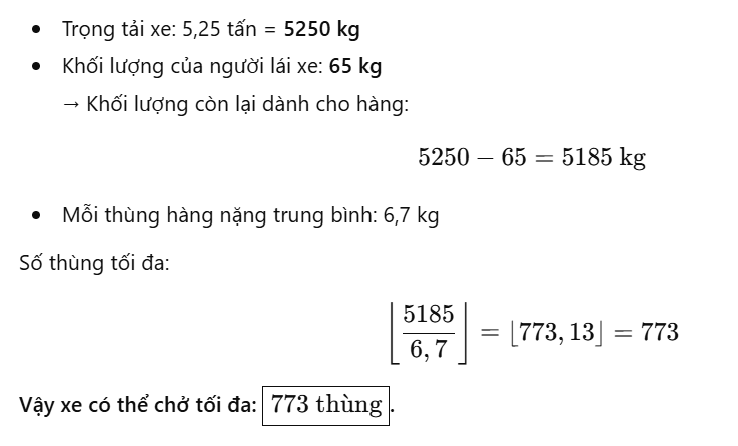 Khối lượng tối đa cho phép mà xe có thể chở trừ đi khối lượng của bác lái xe là: 5250 - 65 = 5185 kg