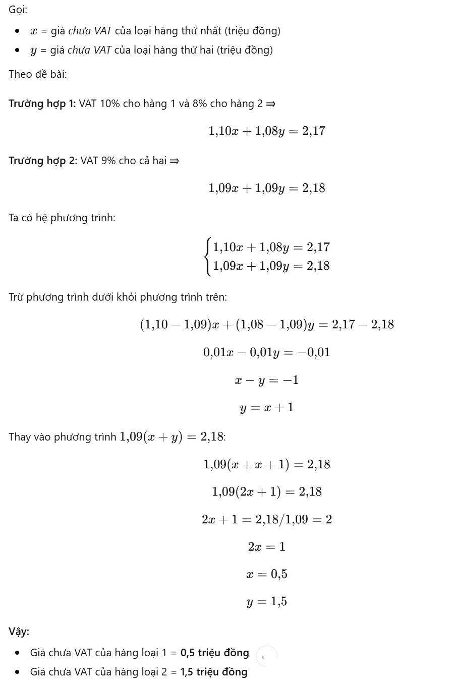 Giả sử thuế VAT là 9% đối với cả hai loại hàng thì người đó phải trả tổng cộng 2,18 triệu đồng nên ta có phương trình: $1,09x + 1,09y = 2,18$ (2)