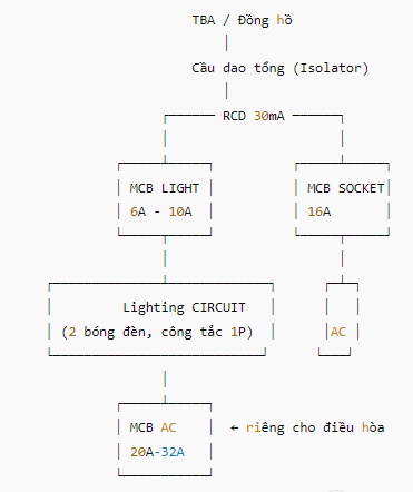 - Từ tủ điện, dây pha đi qua các cầu dao bảo vệ riêng biệt cho từng thiết bị: