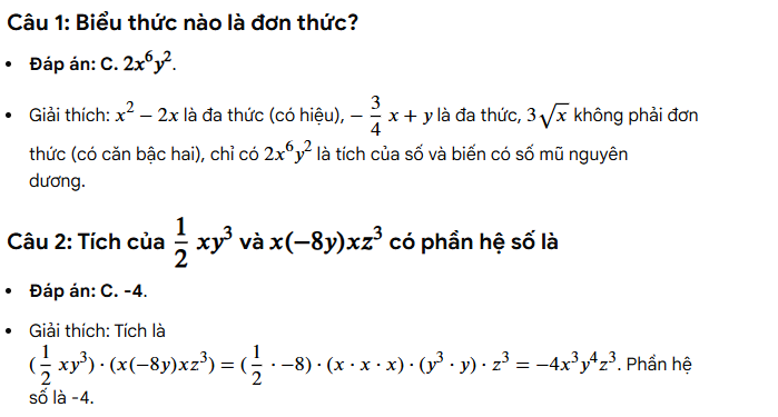 - Trong đơn thức \(-2^3x^2yz^3\), các biến là \(x, y, z\) với các số mũ lần lượt là 2, 1, 3.