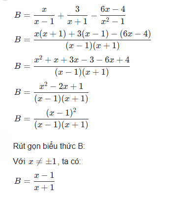 B = \frac{x}{x-1} + \frac{3}{x+1} - \frac{6x-4}{(x-1)(x+1)}