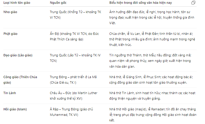 - Nho giáo: \n+ Nguồn gốc: Trung Quốc cổ đại \n+ Biểu hiện trong đời sống văn hóa - hiện nay: \n* Nho giáo đã ảnh hưởng đến Việt Nam từ rất sớm, có thể nói hầu hết các triều đại phong kiến Việt Nam đều sử dụng Nho giáo như một công cụ để cai trị và giáo dục. \n* Nho giáo đã góp phần quan trọng trong việc hình thành các giá trị và chuẩn mực đạo đức truyền thống của người Việt Nam. \n* Nho giáo đã có ảnh hưởng sâu sắc đến đời sống văn hóa của người Việt Nam, từ cách ăn, nói, đi đứng, đến cách đối nhân xử thế trong gia đình và xã hội. \n* Nho giáo đã góp phần quan trọng trong việc hình thành và phát triển các giá trị văn hóa truyền thống của người Việt Nam, như lòng yêu nước, tinh thần đoàn kết, ý thức cộng đồng, lòng nhân ái, tính trung thực, sự tôn trọng và bảo vệ các giá trị văn hóa, v.v. \n- Phật giáo: \n+ Nguồn gốc: Ấn Độ cổ đại \n+ Biểu hiện trong đời sống văn hóa - hiện nay: \n* Phật giáo đã có ảnh hưởng sâu sắc đến đời sống văn hóa của người Việt Nam, từ cách ăn, nói, đi đứng, đến cách đối nhân xử thế trong gia đình và xã hội. \n* Phật giáo đã góp phần quan trọng trong việc hình thành và phát triển các giá trị văn hóa truyền thống của người Việt Nam, như lòng từ bi, tinh thần nhân ái, sự tôn trọng và bảo vệ các giá trị văn hóa, v.v. \n* Phật giáo đã có ảnh hưởng sâu sắc đến đời sống tinh thần của người Việt Nam, từ cách nhìn nhận về cuộc sống, về cái chết, về sự sống và cái chết, về sự vô thường của cuộc đời, v.v. \n- Đạo giáo: \n+ Nguồn gốc: Trung Quốc cổ đại \n+ Biểu hiện trong đời sống văn hóa - hiện nay: \n* Đạo giáo đã có ảnh hưởng sâu sắc đến đời sống văn hóa của người Việt Nam, từ cách ăn, nói, đi đứng, đến cách đối nhân xử thế trong gia đình và xã hội. \n* Đạo giáo đã góp phần quan trọng trong việc hình thành và phát triển các giá trị văn hóa truyền thống của người Việt Nam, như lòng yêu nước, tinh thần đoàn kết, ý thức cộng đồng, lòng nhân ái, tính trung thực, sự tôn trọng và bảo vệ các giá trị văn hóa, v.v. \n* Đạo giáo đã có ảnh hưởng sâu sắc đến đời sống tinh thần của người Việt Nam, từ cách nhìn nhận về cuộc sống, về cái chết, về sự sống và cái chết, về sự vô thường của cuộc đời, v.v. \n- Công giáo: \n+ Nguồn gốc: Roma cổ đại \n+ Biểu hiện trong đời sống văn hóa - hiện nay: \n* Công giáo đã có ảnh hưởng sâu sắc đến đời sống văn hóa của người Việt Nam, từ cách ăn, nói, đi đứng, đến cách đối nhân xử thế trong gia đình và xã hội. \n* Công giáo đã góp phần quan trọng trong việc hình thành và phát triển các giá trị văn hóa truyền thống của người Việt Nam, như lòng yêu nước, tinh thần đoàn kết, ý thức cộng đồng, lòng nhân ái, tính trung thực, sự tôn trọng và bảo vệ các giá trị văn hóa, v.v. \n* Công giáo đã có ảnh hưởng sâu sắc đến đời sống tinh thần của người Việt Nam, từ cách nhìn nhận về cuộc sống, về cái chết, về sự sống và cái chết, về sự vô thường của cuộc đời, v.v. \n- Tin lành: \n+ Nguồn gốc: Châu Âu \n+ Biểu hiện trong đời sống văn hóa - hiện nay: \n* Tin lành đã có ảnh hưởng sâu sắc đến đời sống văn hóa của người Việt Nam, từ cách ăn, nói, đi đứng, đến cách đối nhân xử thế trong gia đình và xã hội. \n* Tin lành đã góp phần quan trọng trong việc hình thành và phát triển các giá trị văn hóa truyền thống của người Việt Nam, như lòng yêu nước, tinh thần đoàn kết, ý thức cộng đồng, lòng nhân ái, tính trung thực, sự tôn trọng và bảo vệ các giá trị văn hóa, v.v. \n* Tin lành đã có ảnh hưởng sâu sắc đến đời sống tinh thần của người Việt Nam, từ cách nhìn nhận về cuộc sống, về cái chết, về sự sống và cái chết, về sự vô thường của cuộc đời, v.v. \n- Hồi giáo: \n+ Nguồn gốc: Ả Rập cổ đại \n+ Biểu hiện trong đời sống văn hóa - hiện nay: \n* Hồi giáo đã có ảnh hưởng sâu sắc đến đời sống văn hóa của người Việt Nam, từ cách ăn, nói, đi đứng, đến cách đối nhân xử thế trong gia đình và xã hội. \n* Hồi giáo đã góp phần quan trọng trong việc hình thành và phát triển các giá trị văn hóa truyền thống của người Việt Nam, như lòng yêu nước, tinh thần đoàn kết, ý thức cộng đồng, lòng nhân ái, tính trung thực, sự tôn trọng và bảo vệ các giá trị văn hóa, v.v. \n* Hồi giáo đã có ảnh hưởng sâu sắc đến đời sống tinh thần của người Việt Nam, từ cách nhìn nhận về cuộc sống, về cái chết, về sự sống và cái chết, về sự vô thường của cuộc đời, v.v.