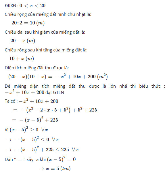 Để giải bài toán này, ta cần tìm giá trị của \( x \) sao cho diện tích miếng đất hình chữ nhật mới là lớn nhất.