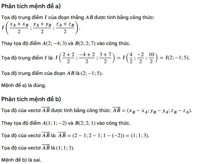 Mệnh đề b) cho rằng tọa độ là $(3;1;1)$, do đó mệnh đề b) là sai.