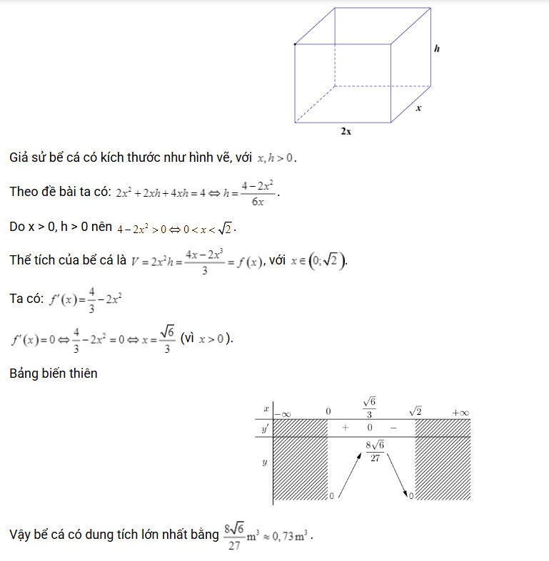 Kết quả cuối cùng: Thể tích lớn nhất của bể cá là khoảng \( 0.77 \, m^3 \).
