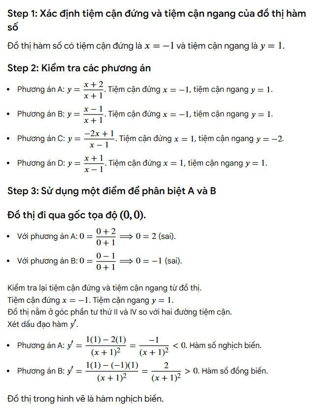- Đồ thị có tiệm cận đứng tại \(x = 1\) và tiệm cận ngang tại \(y = 1\), phù hợp với hàm số \(D.~y=\frac{x+1}{x-1}\).