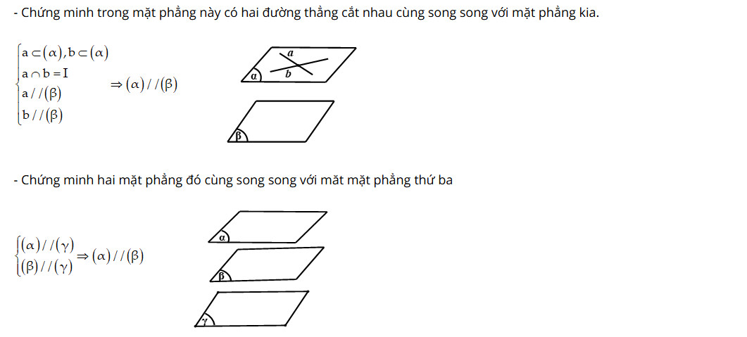 - Hai mặt phẳng song song khi và chỉ khi chúng không có điểm chung và các đường thẳng nằm trên mặt phẳng này đều song song với các đường thẳng tương ứng trên mặt phẳng kia.