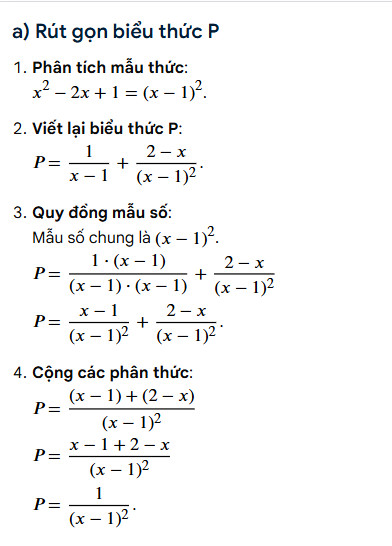 a) Ta có: \( P = \frac{1}{x-1} + \frac{2-x}{x^2-2x+1}. \)