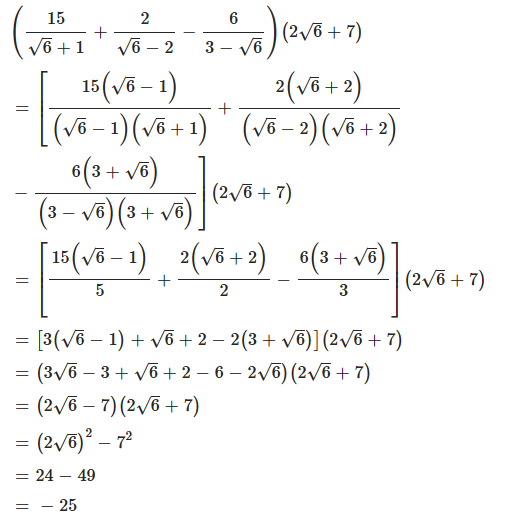 \[ (2\sqrt{6})^2 - 7^2 = 4 \cdot 6 - 49 = 24 - 49 = -25 \]