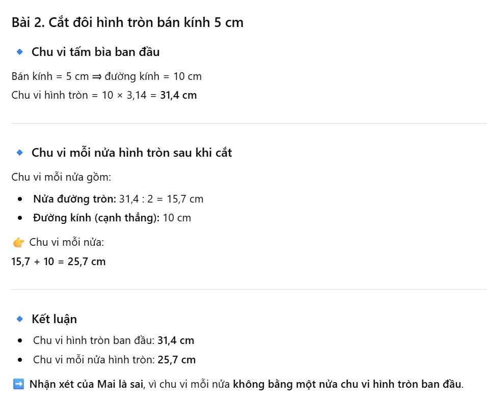 Kết luận: Mai đã nhận xét sai vì chu vi của mỗi tấm bìa không bằng một nửa chu vi của tấm bìa ban đầu.
