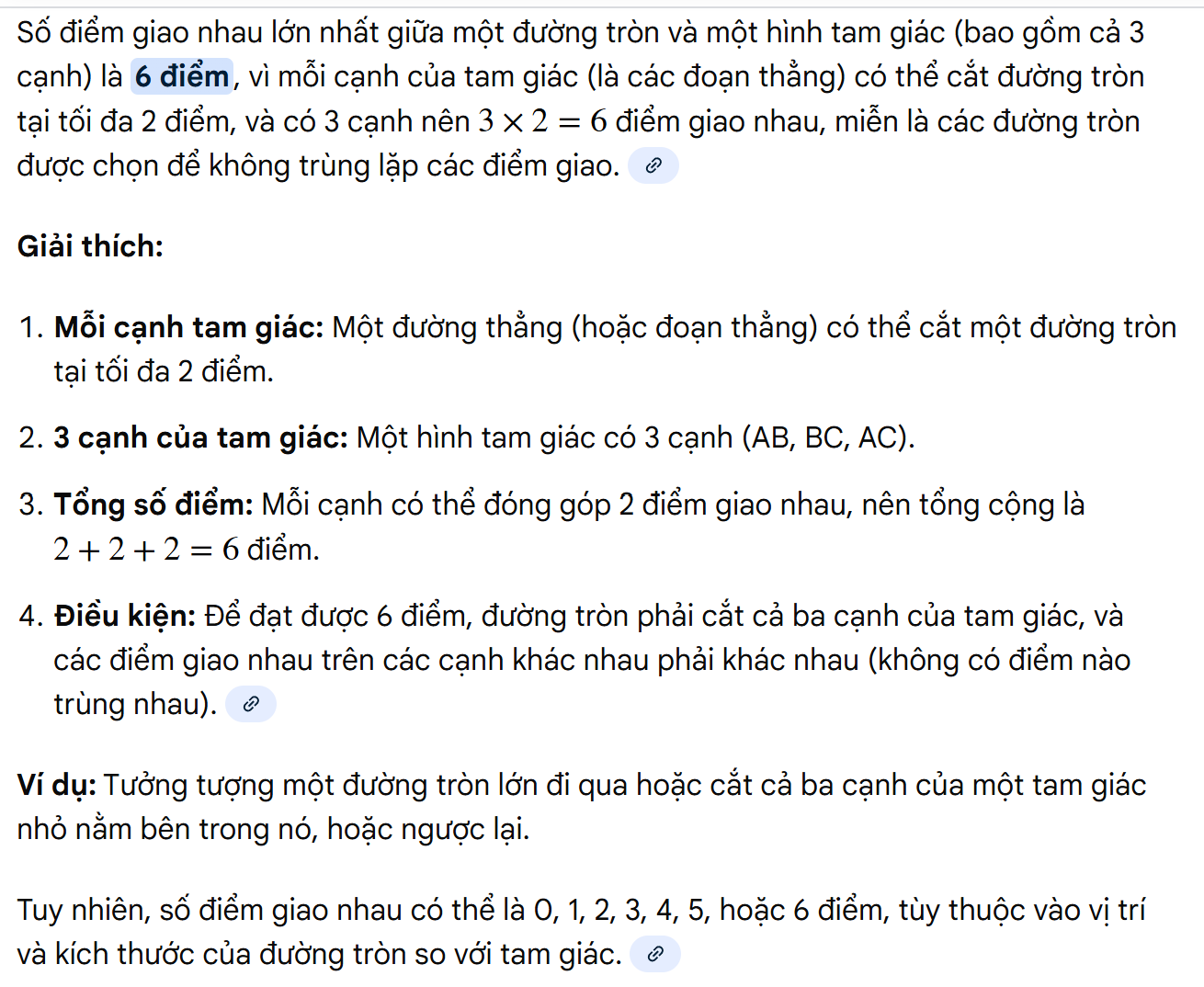 Vậy, số điểm giao nhau lớn nhất của một đường tròn và một hình tam giác là 6. Điều này xảy ra khi đường tròn cắt cả ba cạnh của tam giác, mỗi cạnh tại hai điểm.