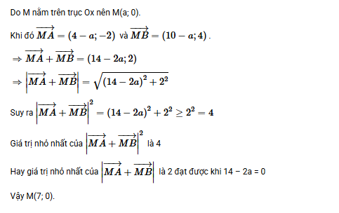 Câu 21: Để tìm tọa độ điểm \( M \) trên trục tung sao cho \( |\overrightarrow{MA} + \overrightarrow{MB}| \) đạt giá trị nhỏ nhất, ta thực hiện các bước sau: 1. Xác định tọa độ điểm \( M \): Vì \( M \) nằm trên trục tung, nên tọa độ của \( M \) có dạng \( M(0; y) \). 2. Biểu diễn các vectơ: - Vectơ \( \overrightarrow{MA} = (4 - 0, -2 - y) = (4, -2 - y) \). - Vectơ \( \overrightarrow{MB} = (10 - 0, 4 - y) = (10, 4 - y) \). 3. Tổng của hai vectơ: \[ \overrightarrow{MA} + \overrightarrow{MB} = (4 + 10, (-2 - y) + (4 - y)) = (14, 2 - 2y) \] 4. Độ dài của tổng vectơ: \[ |\overrightarrow{MA} + \overrightarrow{MB}| = \sqrt{14^2 + (2 - 2y)^2} \] \[ = \sqrt{196 + (2 - 2y)^2} \] \[ = \sqrt{196 + 4 - 8y + 4y^2} \] \[ = \sqrt{4y^2 - 8y + 200} \] 5. Tìm giá trị nhỏ nhất của biểu thức: Biểu thức cần tìm giá trị nhỏ nhất là \( 4y^2 - 8y + 200 \). Đây là một hàm bậc hai có dạng \( ax^2 + bx + c \) với \( a = 4 \), \( b = -8 \), \( c = 200 \). Giá trị nhỏ nhất của hàm bậc hai đạt được tại \( y = -\frac{b}{2a} = -\frac{-8}{2 \times 4} = 1 \). 6. Kết luận: Tọa độ điểm \( M \) trên trục tung sao cho \( |\overrightarrow{MA} + \overrightarrow{MB}| \) đạt giá trị nhỏ nhất là \( M(0; 1) \). Câu 22: Để tìm tọa độ điểm \( E \) thỏa mãn đẳng thức vectơ \(\overrightarrow{AE} - 3\overrightarrow{EC} + 2\overrightarrow{EB} = \overrightarrow{0}\), ta thực hiện các bước sau: 1. Biểu diễn các vectơ theo tọa độ: - Vectơ \(\overrightarrow{AE} = (x - 2, y - 4)\) với \( E(x, y) \). - Vectơ \(\overrightarrow{EC} = (2 - x, 5 - y)\). - Vectơ \(\overrightarrow{EB} = (-1 - x, 3 - y)\). 2. Thay vào đẳng thức vectơ: \[ \overrightarrow{AE} - 3\overrightarrow{EC} + 2\overrightarrow{EB} = \overrightarrow{0} \] Thay các vectơ vào, ta có: \[ (x - 2, y - 4) - 3(2 - x, 5 - y) + 2(-1 - x, 3 - y) = (0, 0) \] 3. Tính toán từng thành phần: - Thành phần hoành độ: \[ (x - 2) - 3(2 - x) + 2(-1 - x) = 0 \] \[ x - 2 - 6 + 3x - 2 - 2x = 0 \] \[ 2x - 10 = 0 \] \[ 2x = 10 \Rightarrow x = 5 \] - Thành phần tung độ: \[ (y - 4) - 3(5 - y) + 2(3 - y) = 0 \] \[ y - 4 - 15 + 3y + 6 - 2y = 0 \] \[ 2y - 13 = 0 \] \[ 2y = 13 \Rightarrow y = \frac{13}{2} \] 4. Kết luận: Tọa độ điểm \( E \) là \( \left(5, \frac{13}{2}\right) \).