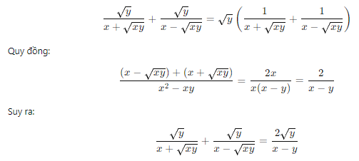 $=\left\lbrack\frac{\sqrt{y}}{\sqrt{x}\left(\sqrt{x}+\sqrt{y}\right)}+\frac{\sqrt{y}}{\sqrt{x}\left(\sqrt{x}-\sqrt{y}\right)}\right\rbrack.\frac{\left(\sqrt{x}-\sqrt{y}\right)\left(\sqrt{x}+\sqrt{y}\right)}{2\sqrt{y}}$