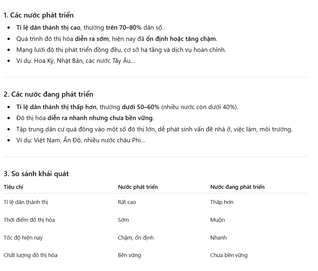 Sự khác nhau về tỉ lệ dân thành thị giữa các nước phát triển và đang phát triển có thể được tóm tắt như sau: