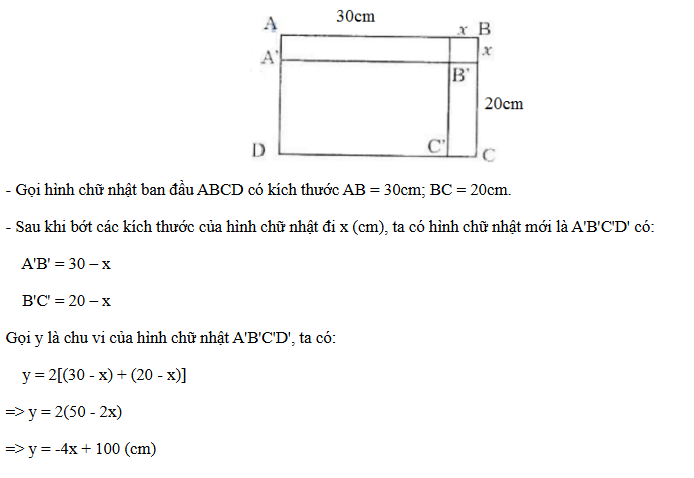 Chu vi hình chữ nhật thu được là: $2[(30 - x) + (20 - x)]$