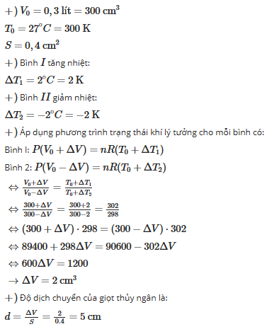 Gọi \( x \) (m) là khoảng dịch chuyển của giọt thủy ngân, làm tăng thể tích bình I lên \( \Delta V = S x \), và giảm thể tích bình II đi \( \Delta V = S x \).