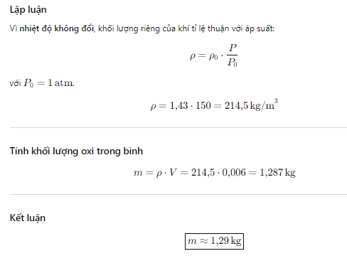 - Khối lượng riêng của oxi ở điều kiện tiêu chuẩn (0°C, 1 atm) là \(\rho_0 = 1,43 \, kg/m^3\).