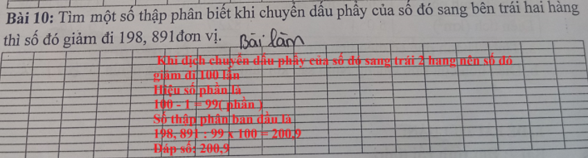 Khi chuyển dấu phẩy của số đó sang bên trái hai hàng tức là ta đã chia số đó cho 100.