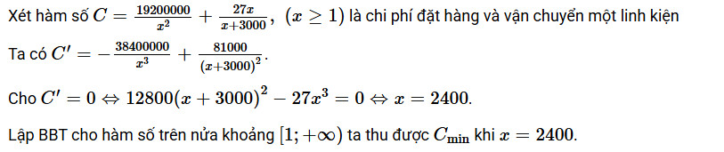 Để tìm giá trị của \( x \) sao cho chi phí đặt hàng và vận chuyển cho mỗi linh kiện là nhỏ nhất, chúng ta sẽ sử dụng phương pháp đạo hàm để tìm điểm cực tiểu của hàm số \( C(x) = \frac{19200000}{x^2} + \frac{27}{x} + 3000 \).