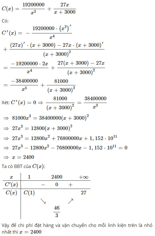 Để tìm giá trị của \( x \) sao cho chi phí đặt hàng và vận chuyển \( C \) là nhỏ nhất, chúng ta sẽ sử dụng đạo hàm để tìm điểm cực tiểu của hàm số \( C \).