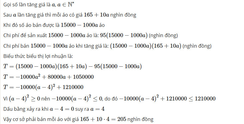 Bài 1: Giả sử chủ cửa hàng tăng giá 10 nghìn đồng n lần, khi đó giá bán một chiếc áo là: 165 + 10n (nghìn đồng) Số áo bán được trong một tháng là: 15000 – 1000n (chiếc) Lợi nhuận thu được là: (165 + 10n – 95)(15000 – 1000n) = (70 + 10n)(15000 – 1000n) = 10(70 + 10n)(1500 – 100n) = 100(7 + n)(150 – 10n) = 100(1050 – 70n + 150n – 10n²) = 100(1050 + 80n – 10n²) = 100[1050 + 80(n – 4) – 10(n – 4)²] ≤ 100[1050 + 80 × 0 – 10 × 0] = 105000 (nghìn đồng) Dấu “=” xảy ra khi n = 4 Vậy giá bán một chiếc áo để có lợi nhuận nhiều nhất là: 165 + 10 × 4 = 205 (nghìn đồng)