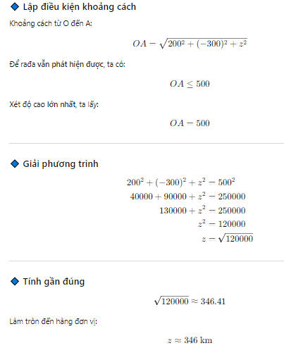 Giả sử máy bay đang ở vị trí \( A(200; -300; z) \). Khoảng cách từ điểm \( A \) đến gốc tọa độ \( O(0; 0; 0) \) được tính theo công thức khoảng cách trong không gian ba chiều: