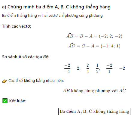 - Kiểm tra tính cùng phương của \(\overrightarrow{AB}\) và \(\overrightarrow{AC}\):