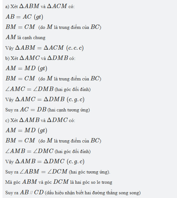 Theo trường hợp cạnh - cạnh - cạnh (c.c.c), ta có \(\Delta ABM = \Delta ACM\).