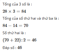 trung bình cộng của ba số là 28. số thứ nhất là 14, số thứ hai hơn số thứ ba là 22. số thứ hai là?