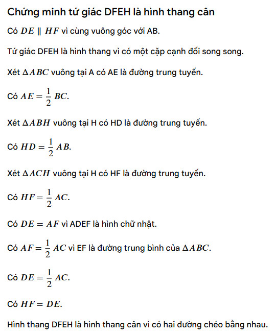 Để chứng minh tứ giác DFEH là hình thang cân, ta cần chứng minh rằng tứ giác này có hai cạnh đối song song và hai cạnh bên bằng nhau.