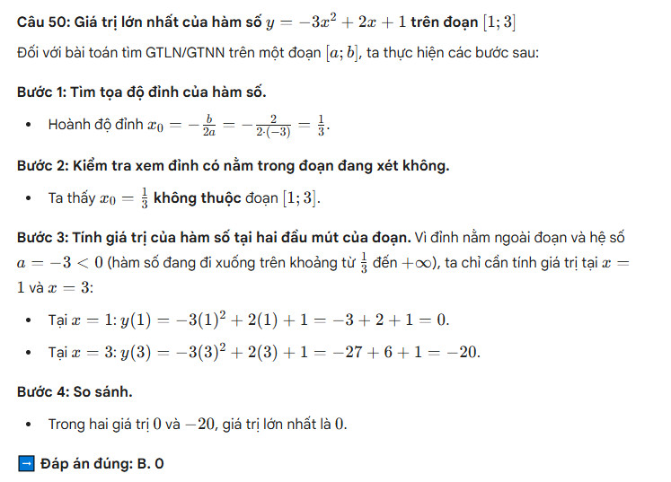 Trên đoạn \([1, 3]\), giá trị lớn nhất của hàm số sẽ đạt được tại một trong hai đầu mút của đoạn, vì đỉnh của parabol nằm bên ngoài đoạn này.