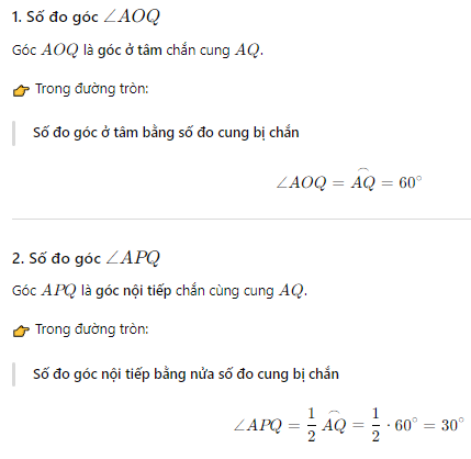 - Vậy, \(\angle APQ = \frac{1}{2} \times 60^\circ = 30^\circ\).