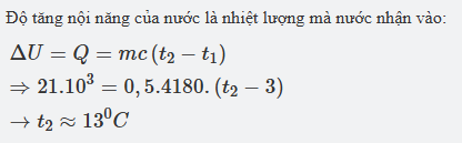 Một bình chứa 0,5 kg nước ở nhiệt độ 3°C. Bình được đun nóng và nội năng của nước trong bình tăng lên thêm 21 kJ. Nhiệt dung riêng của nước là 4180 J/kg.K. Nhiệt độ của nước sau khi đun là bao nhiêu độ...